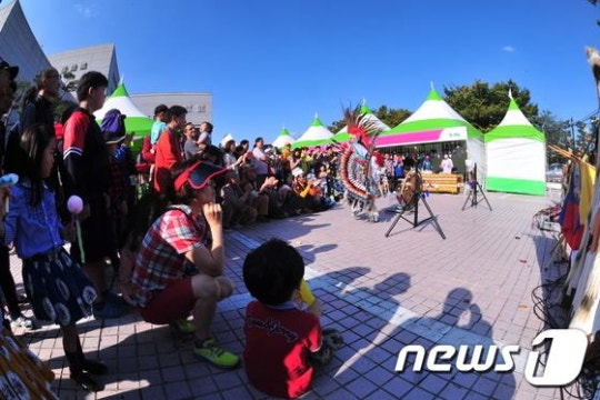 【울산=뉴시스】구미현 기자 = 제49회 처용문화제 마지막날인 11일 축제 하이라이트인 거리 퍼레이드 시작 전 울산시 중구 동헌 앞에서 처용무 공연이 펼쳐지고 있다. 올해 처용문화제에는 나흘간 35만 명(주최측 추산)이 다녀갔다. 2015.10.11. gorgeouskoo@newsis.com그동안 월드뮤직페스티벌이 유럽, 남미 음악을 주로 선보였다면 처용월드뮤직은 중국을 비롯해 일본, 대만 등 아시아지역으로 그 범위를 넓혔다.